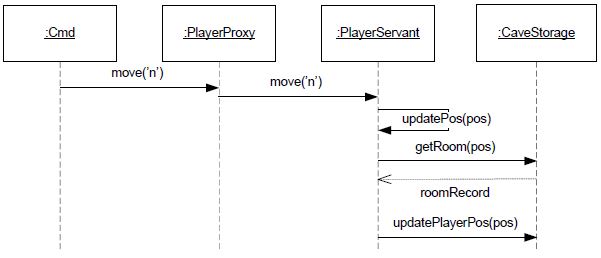 To given an impression of the strangling process, consider the PlayerServant.move() method. At the moment, it is implemented by modifying state in the underlying CaveStorage, as outlined by this sequence diagram: